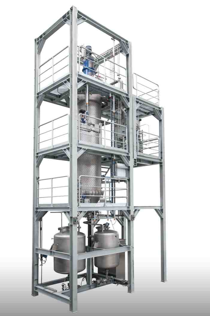 Wiped Film and Thin Film Evaporators comprise a cylindrical heating jacket and an inner rotating wiper system, dispersing the product onto the heating jacket as a thin and turbulent film. The turbulence within the wiped film enhances heat and mass transfer, achieving a high evaporation rate with short residence times, often within a single processing pass. The separated vapors are either condensed on an external condenser or further separated in a fractional column.